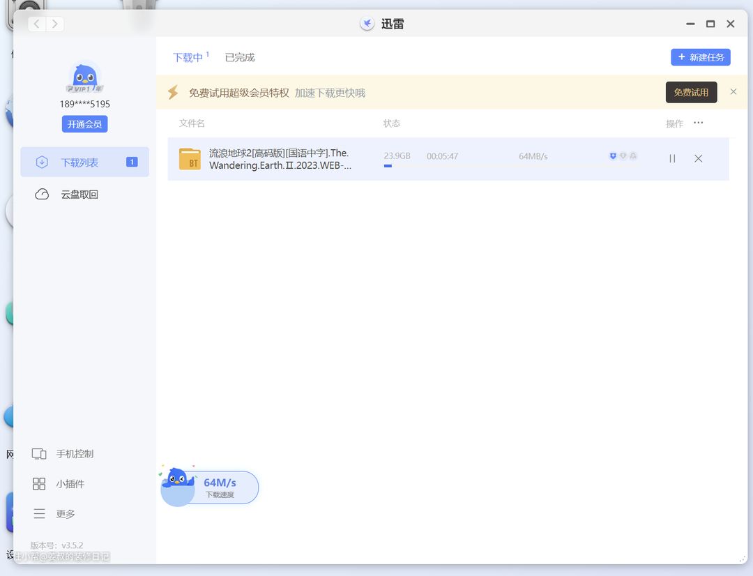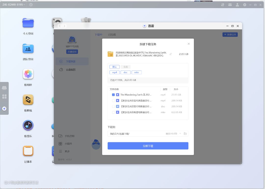 极空间还内置了迅雷,可以添加BT等实现远程下载,而且速度很给力,我家500兆宽带,下载速度稳定在50-60MB/s,感觉像默认开了会员一样快,而且还没有乱七八糟的弹窗广告。