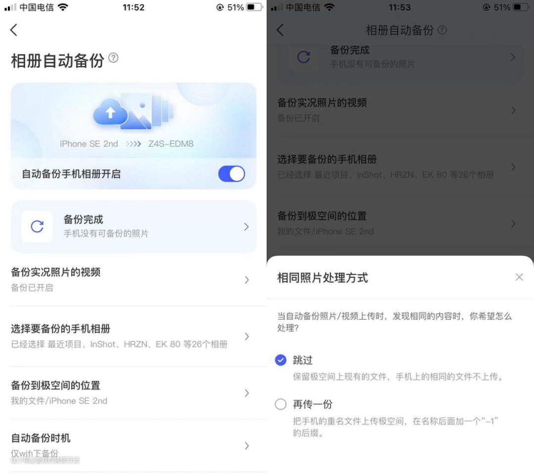 极空间Z4S还支持手机相册自动备份,包括实况图片备份,对我这种手机拍照重度用户来说,非常有用。拍完照片后极空间APP就会自动备份到NAS中,本地图片可以删除,不用担心手机存储空间不足的问题。在上传的内容中,极空间Z4S同样支持查重功能,可以设置只传一次,避免重复占用空间。