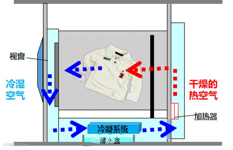 热泵式烘干,跟空调一个原理,所以烘干温度较低,比较不伤衣服。