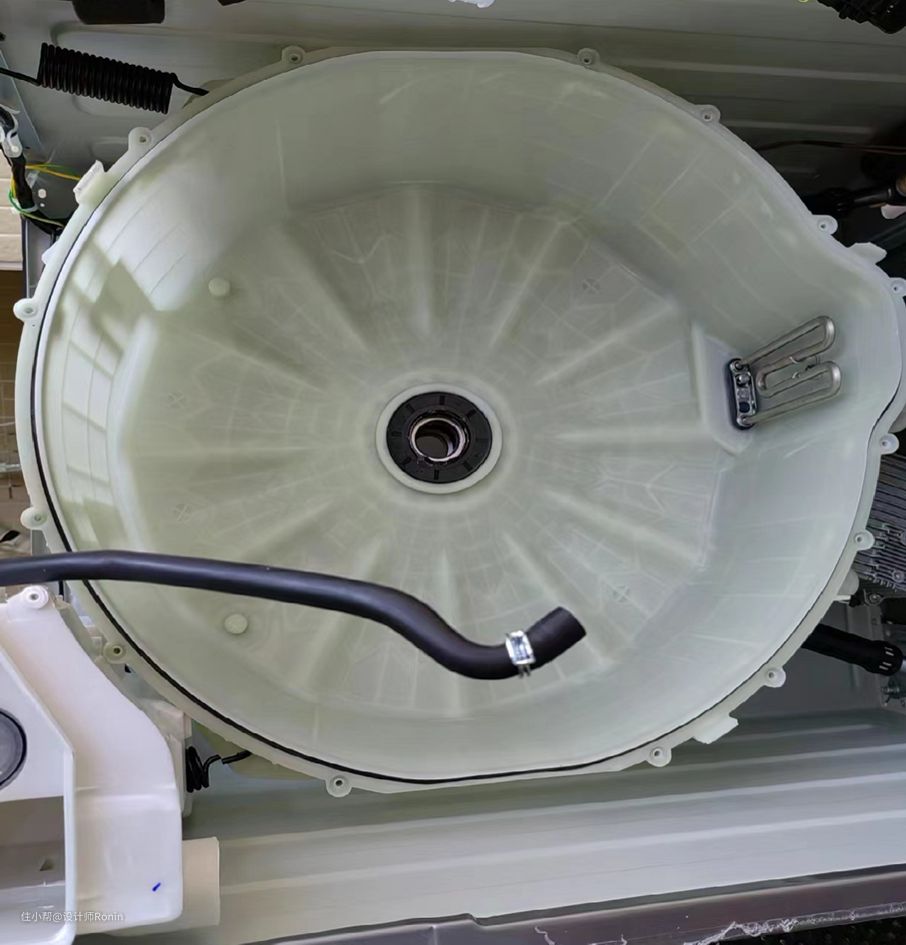 这款T1W洗衣机搭载的是光滑外筒,拆开后可以看到,加强筋都设计在了外筒外侧,里侧都是光滑了,这样尽量避免污垢附着,不会存在清洁死角。