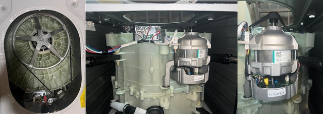 同时拆机后可以看到这款洗衣机的用料很扎实,且不说一体式的门板用料比传统洗衣机筒门更厚实,机身内部严密的走线,扎实的机身用料,强大的电机,都是洗衣机经久耐用的基础。