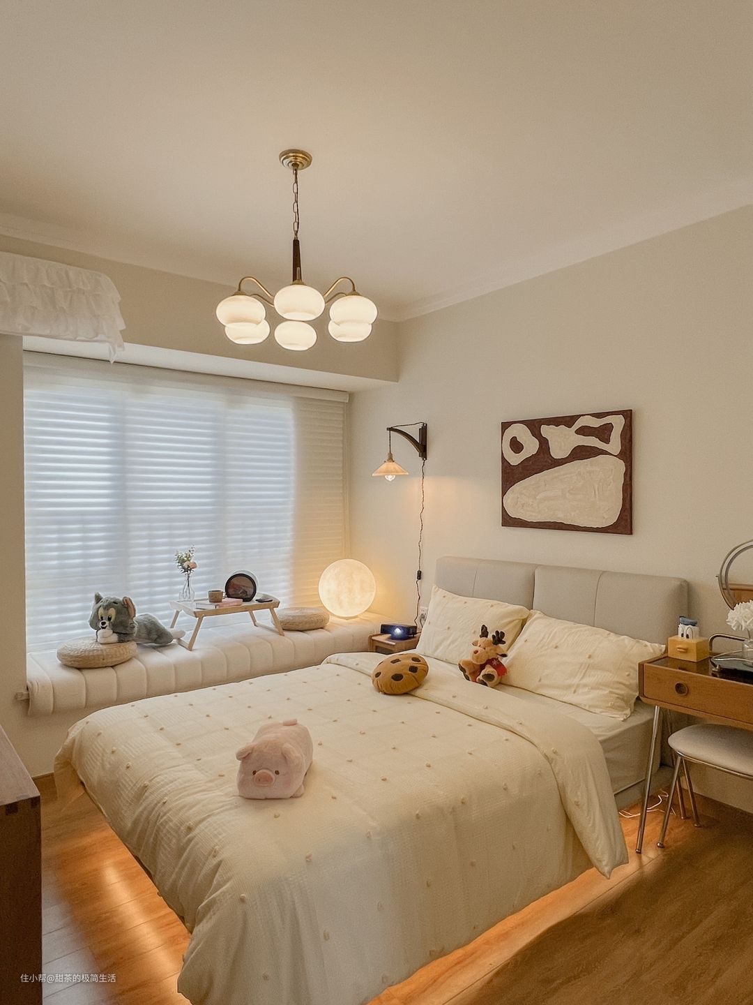 床尾空间布置了一组复古风装饰柜,墙面则做了留白处理,投影仪可以直接投屏上墙,躺在床上就能追剧、看大片,太羡慕这样的生活了!