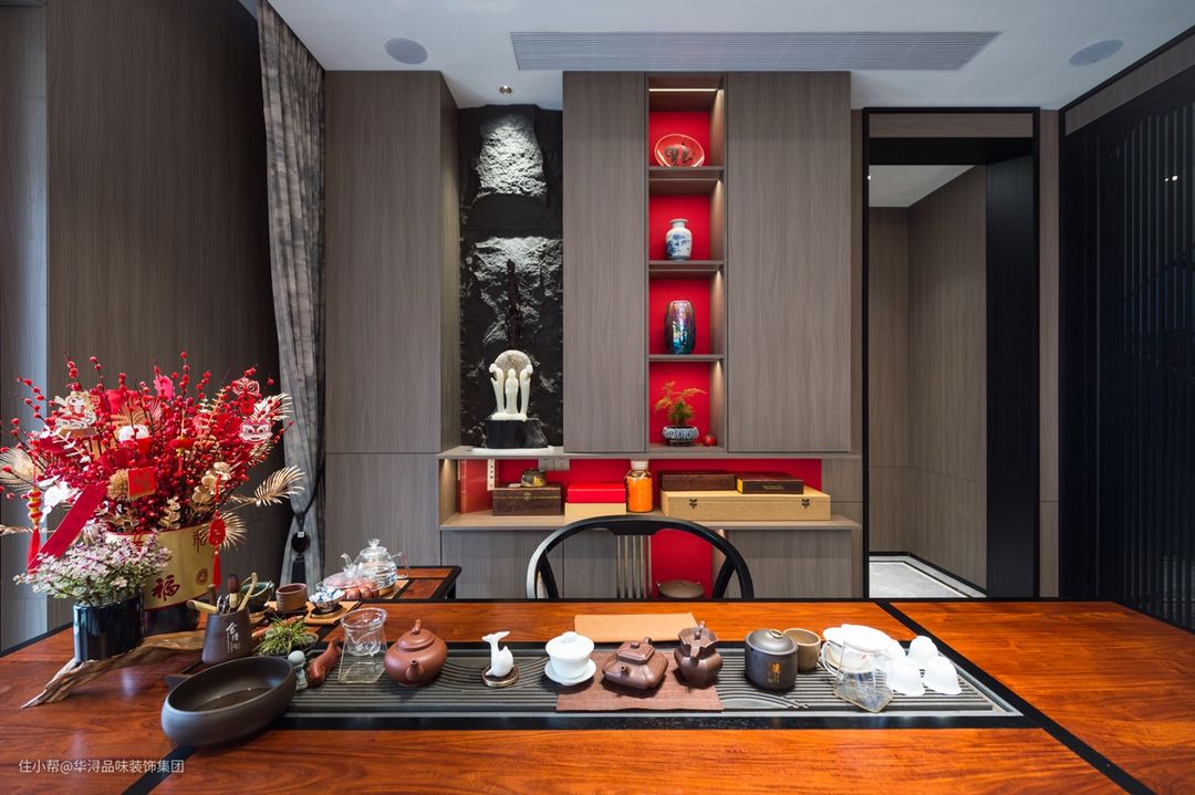 浅灰色定制柜和红褐色的中式家具搭配,再搭配一套充满禅意的茶具,享受一段烹茶品茗的生活艺术,也可以在茶室中感受一份闲适自在的心情。