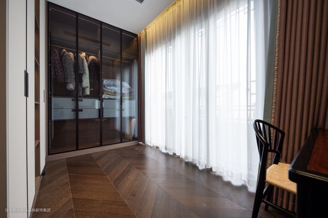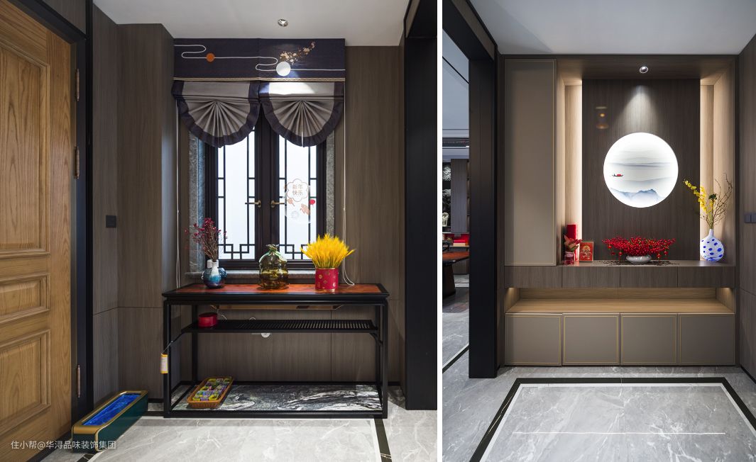 新中式风格空间上讲究层次对称,一楼玄关处设置一小端景,步步为景。而与其对称的,则是玄关柜,以原木为主要材质,简洁线条勾勒的柜门板融入了无拉手设计,实用性强。