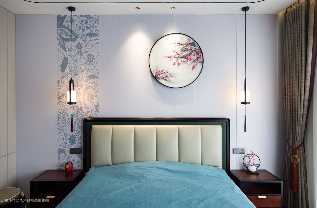 睡眠空间,我们希望给居住者展现一种,静的力道。背景墙我们采用了原始建筑结构,运用了东方的设计方法,对墙面的勾勒呈现了东方韵律,留白则是以表安静。