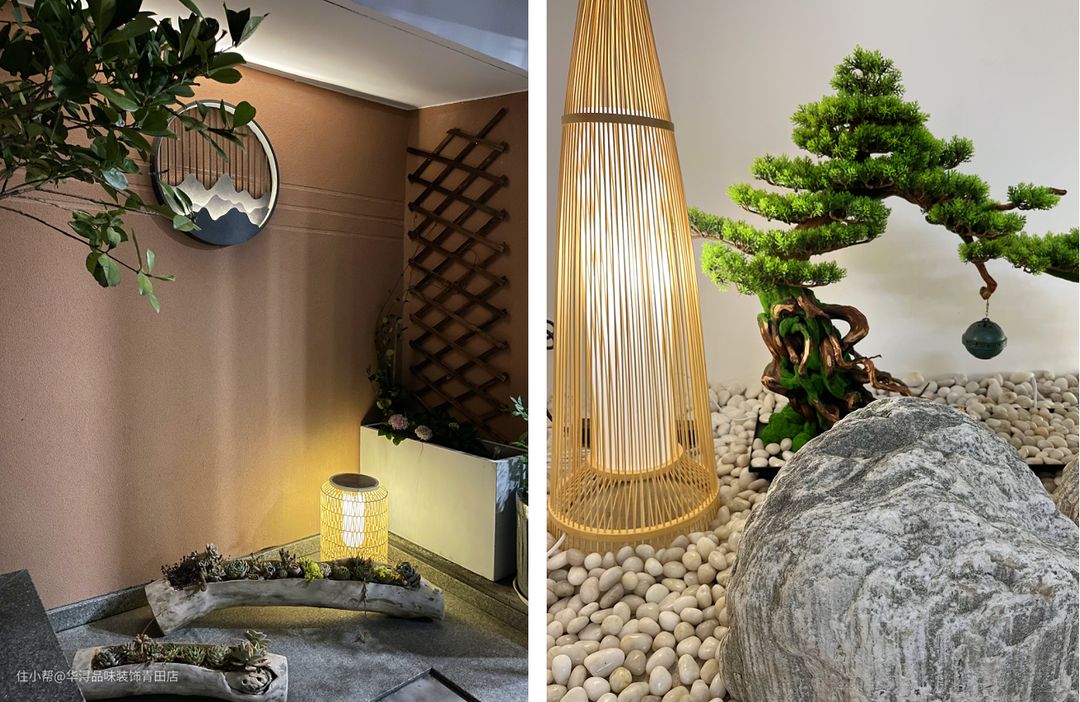 “枯山水”做装饰,整个空间给人一种禅意十足的感觉。浅棕色打底,搭配木栏、盆栽、鹅卵石等元素,不需要过多的修饰和造型,只有一些简单的线条和色彩,营造出一种清新自然的氛围。