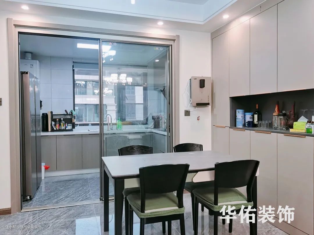 客卫功能面积局促,设计师在此基础上借用过道的部分空间给卫生间做干区使用,实现了卫生间的干湿分离,干区浴室柜的双面盆设计满足了早上家人的同一时间段的高频的使用也不失美观大气。减少了过道空间浪费问题,同时背面用来做餐边柜,解决了餐区缺失的违和感以及餐边柜储物的一系列问题。