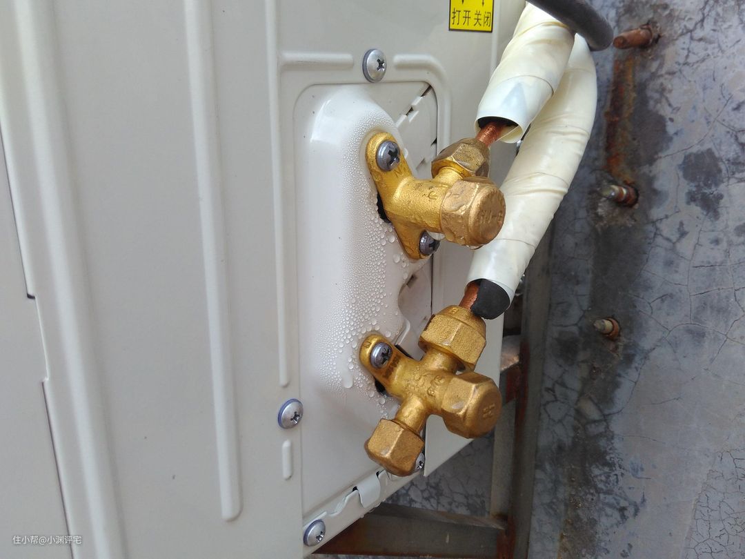 空调室外机的侧面有一大一小两个金属阀门,阀门里面装的就是制冷剂。
