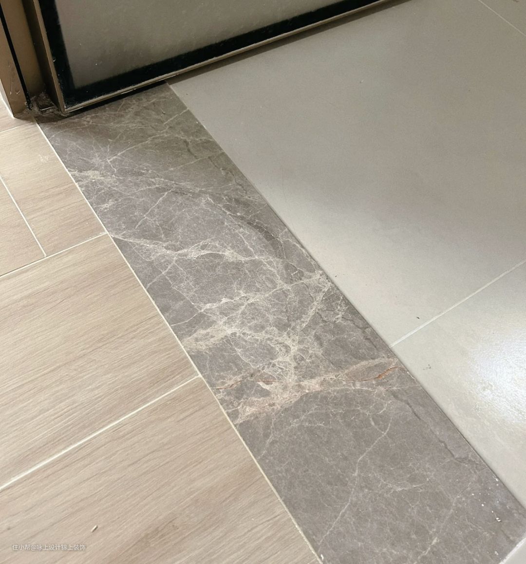 20.卫生间是可以不做过门石,做瓷砖通铺的,瓷砖倒45度角。只要在门口这个位置,加一个两公分的小条,做个海棠角,和下沉式的淋浴房做法一样。这考验瓦工手艺,做不到的就老老实实加块关门石。