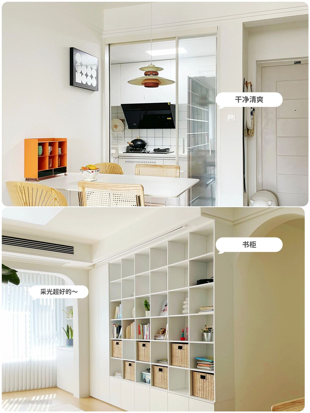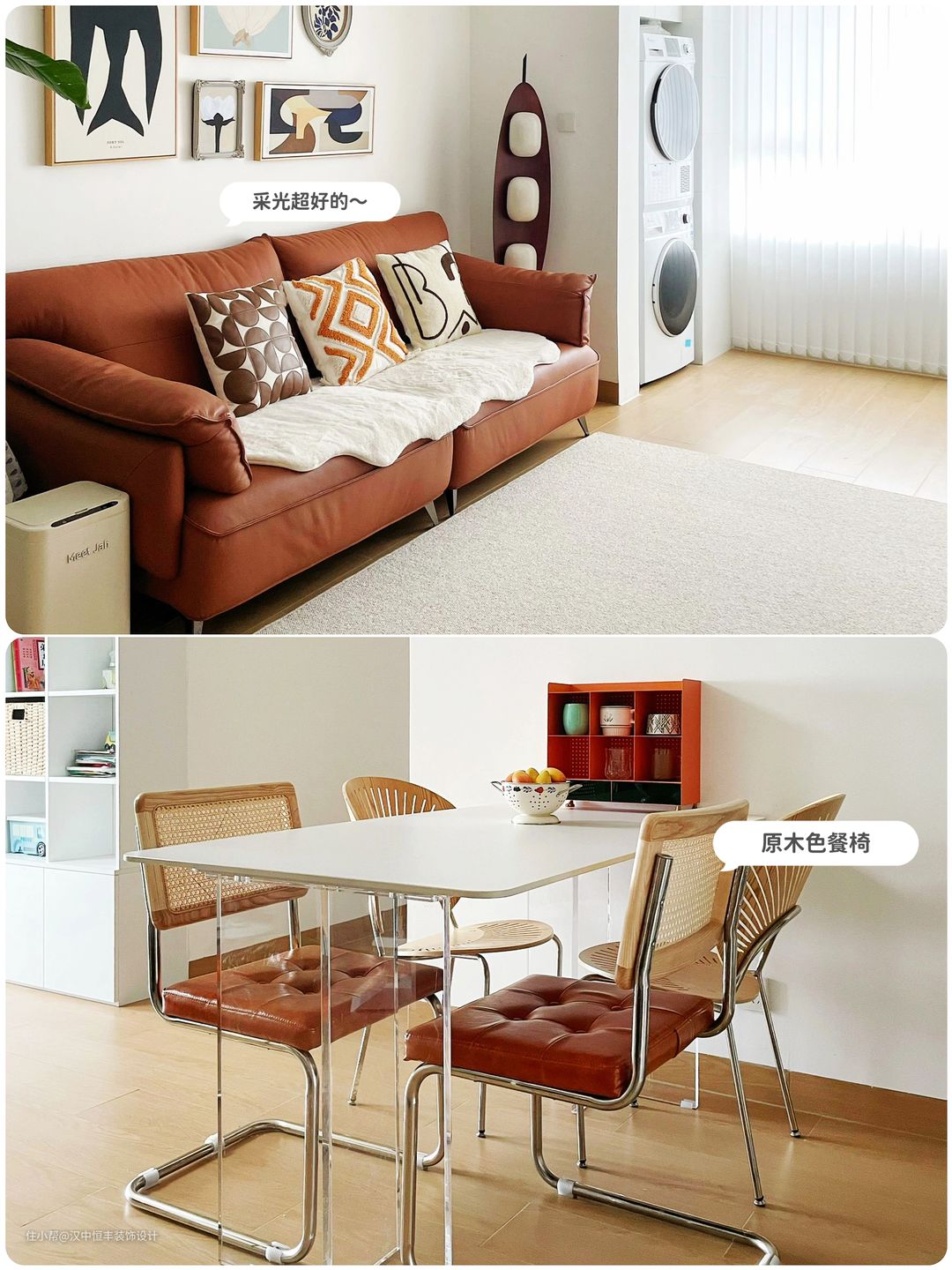 🔺色彩搭配不超过3种,化繁为简,空间小就不选笨重家具,餐桌椅虽然在厨房门口,但是亚克力桌腿很通透不会显得拥挤,客厅选直排沙发舍弃茶几更宽敞。