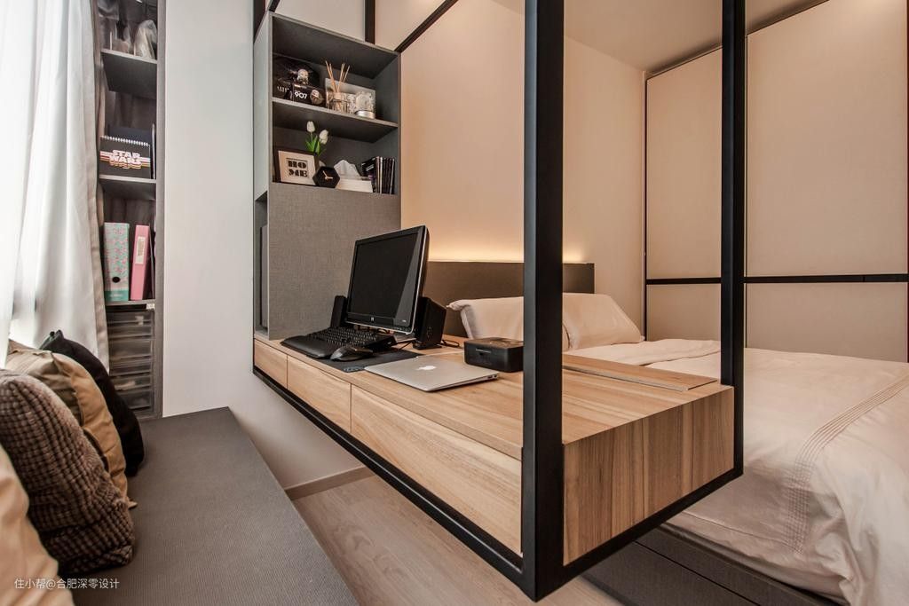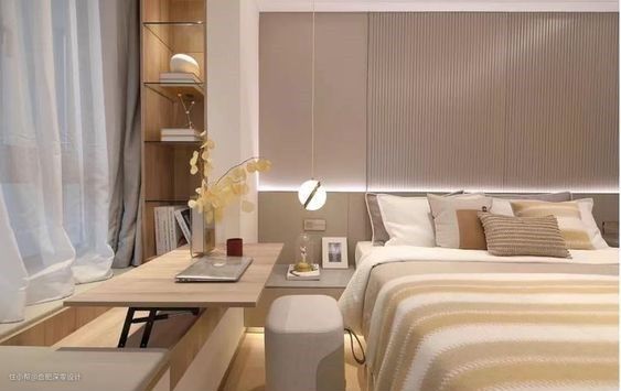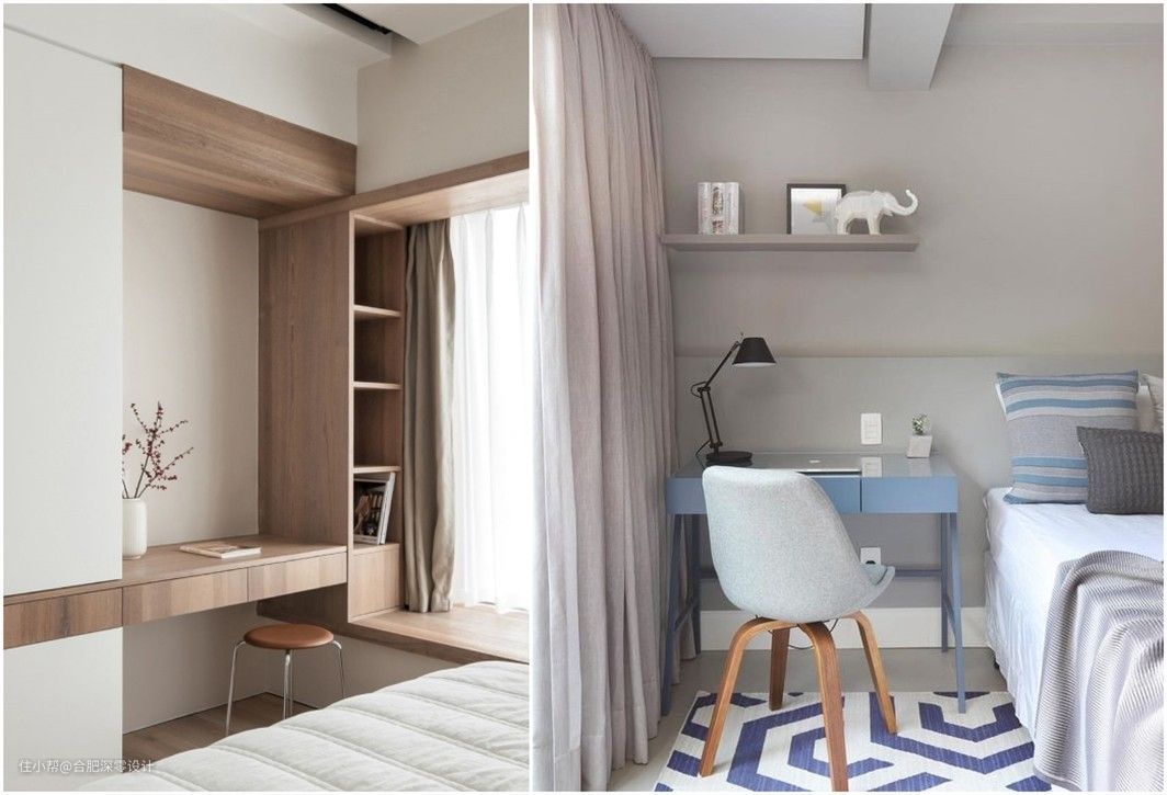 越小的卧室越在意空间利用,抛弃常规设书桌的做法,仅用一块抽板就能解决,平时收起来既不用担心磕碰,也避免了影响日常活动,尤其放在儿童房等小次卧中无疑是一个不错的选择。像下面这样谁能找到书桌在哪: