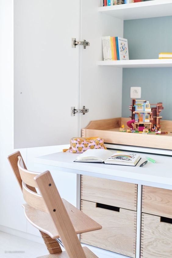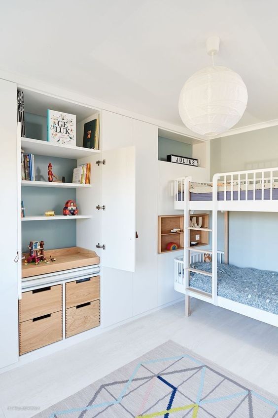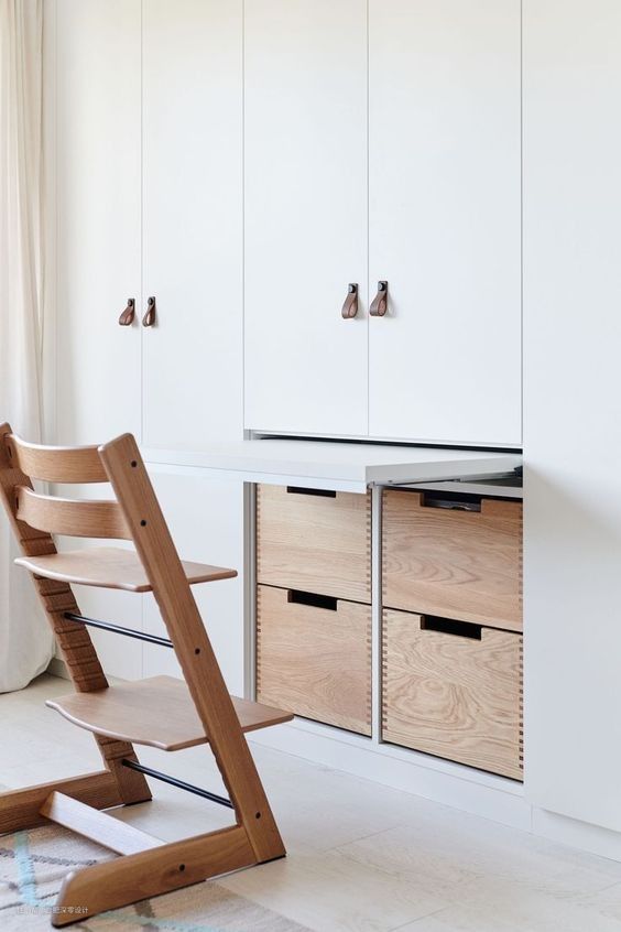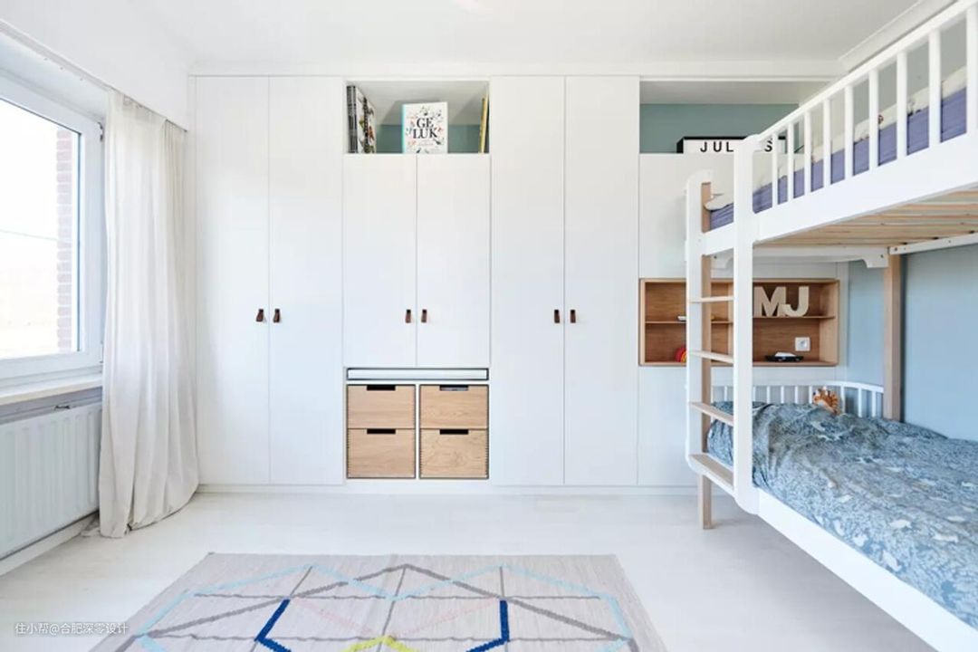 尤其在儿童房内,咱们并没必要一味追求封闭式收纳,局部留空置物,借着空出来的格子,妥善安置塑料盒或者拉篮,代替抽屉使用,设在柜子底部还能培养孩子有拿有放的行为习惯。
