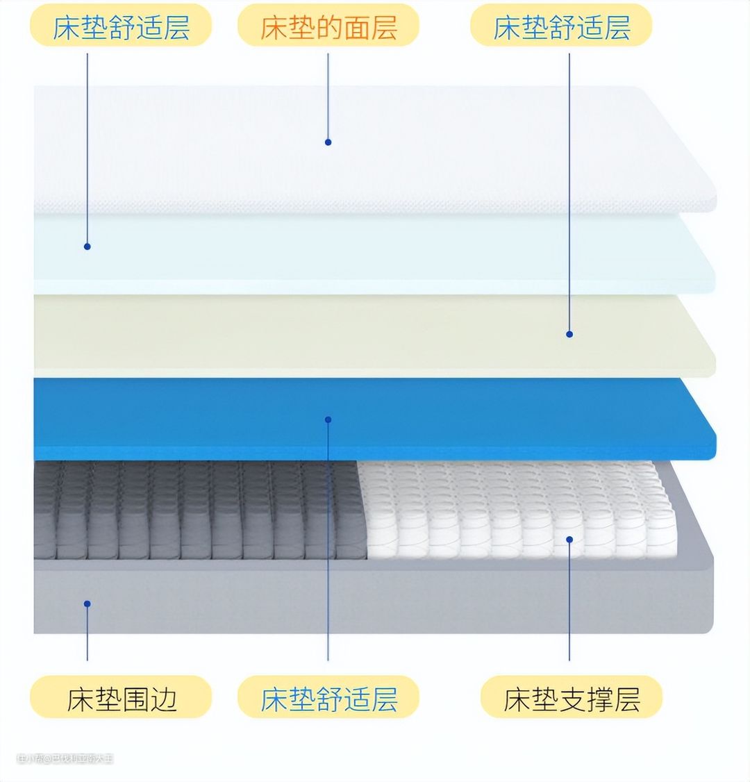 我对新床垫的需求是:软硬适中、且支撑性要好。要做到这些,离不开床垫结构的互相配合,常见的床垫的结构从上到下分别是:面层、舒适层、支撑层和围边。