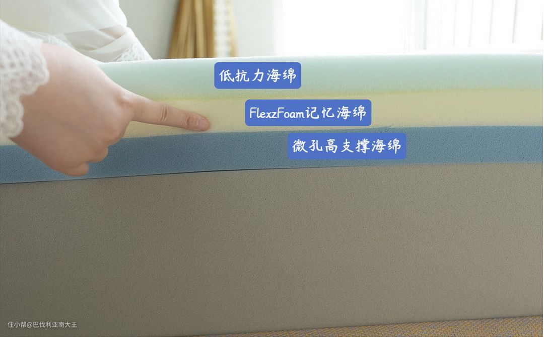 这款床垫的填充层因为有低抗力海绵的加入,有非常好的包裹感,我在实际睡眠时感受明显。