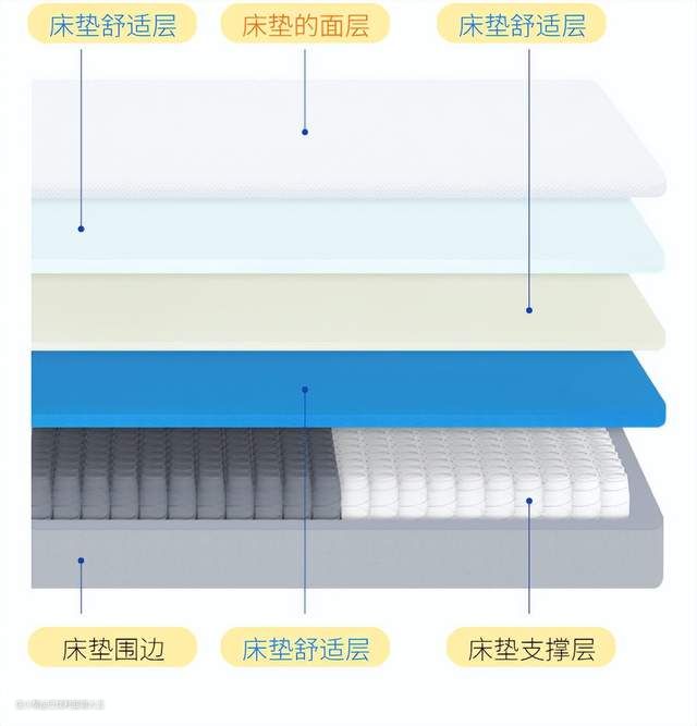 我对新床垫的需求是:软硬适中、且支撑性要好。要做到这些,离不开床垫结构的互相配合,常见的床垫的结构从上到下分别是:面层、舒适层、支撑层和围边。