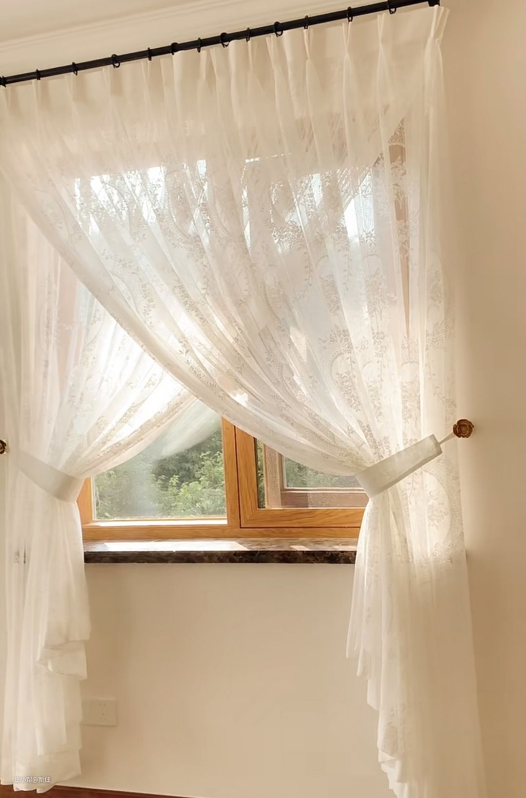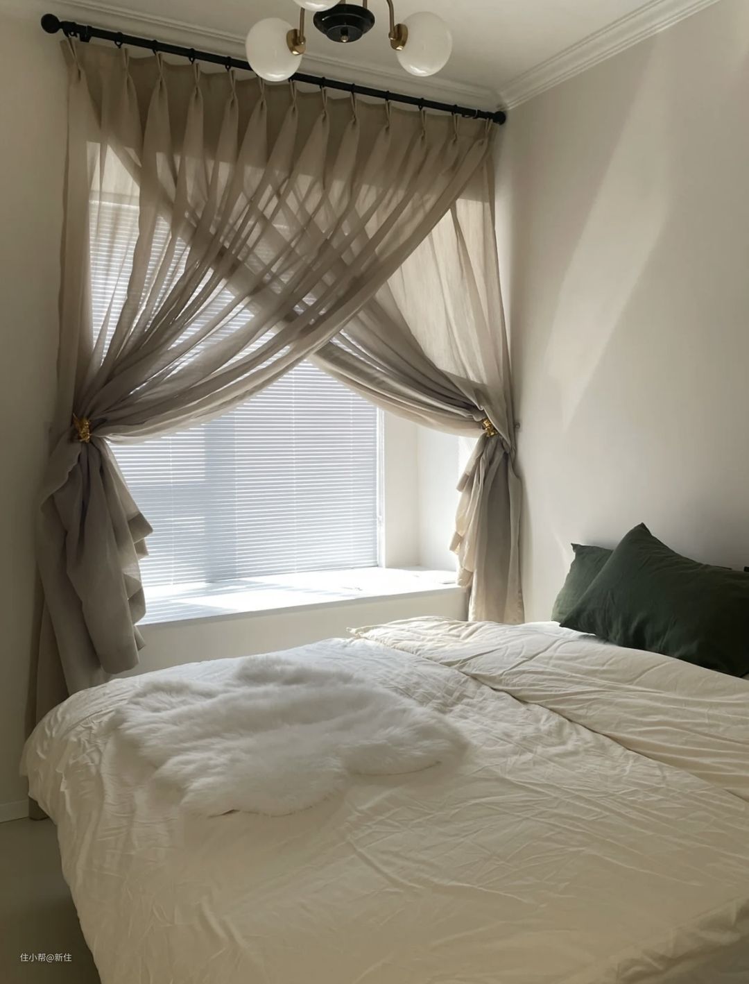 又或者,颇具复古风类型的窗帘,搭配纱帘时,选择做旧褶皱款,如燕尾纱,氛围感更足。
