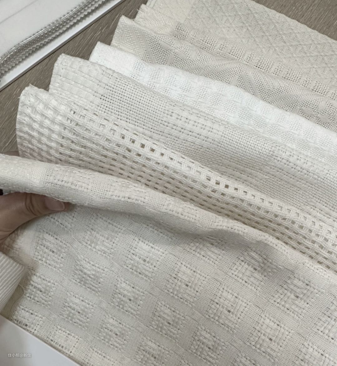 横向花纹+肌理感小面积看着还好,挂成窗帘后,就成了类似褶皱的感觉,整个窗帘显得不平整,效果势必会大打折扣。