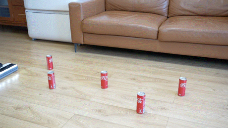 ▼更大的扭转角度带来了更小的转弯半径,在绕过障碍物的时候,云鲸S1要更加轻松自如,不需要调整机身角度,也能在S型摆放的可乐罐之间一次性通过。