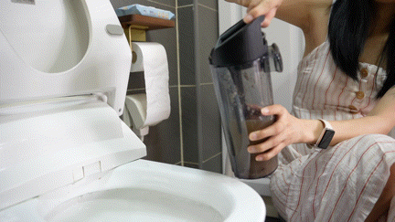 ▼自清洁完之后的最后一步就是倒掉污水箱中的污水了。添可的污水箱没有做干湿分离处理,所以只能一股脑的倒进马桶里。