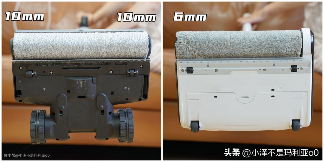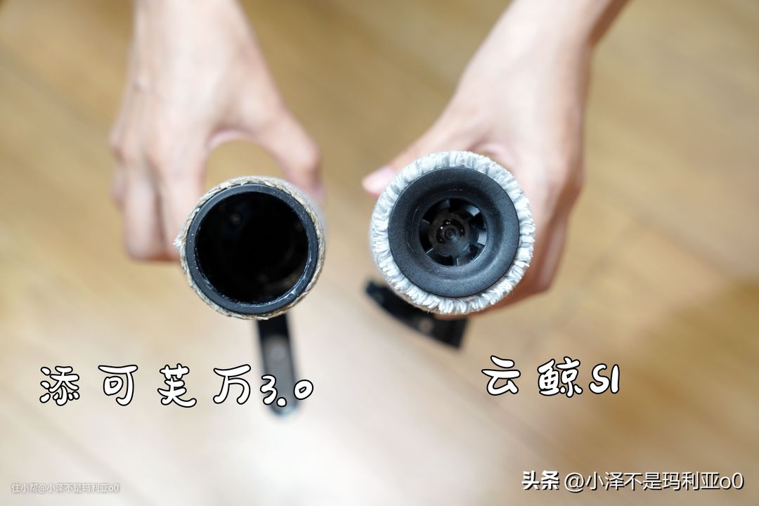 比如沿边清洁,添可芙万3.0的滚刷做了双贴边设计,左右间距都为10mm,而云鲸的滚刷是单贴边设计,右侧最窄处仅有6mm。