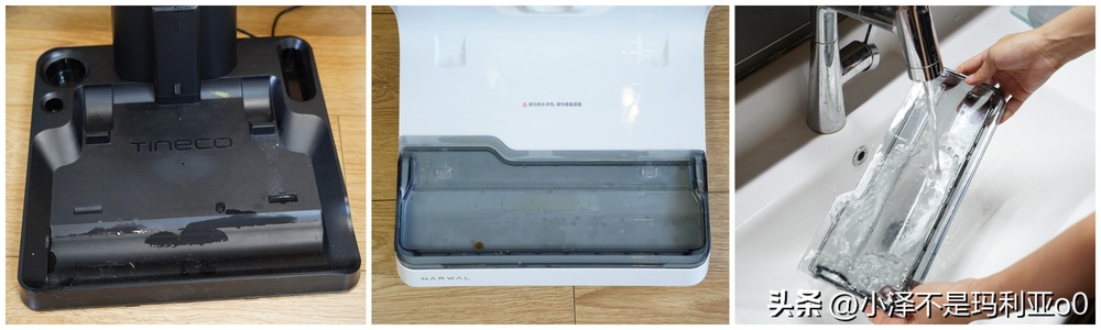 ▼自清洁完之后,两台洗地机的底座上都会残留一点水渍,如果长时间不清理,同样可能滋生细菌异味。云鲸这次给充电底座设计了一个可拆卸的托盘,可以直接拿下来放在水龙头下清洗,后期打理起来我觉得要更方便一些。