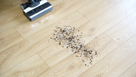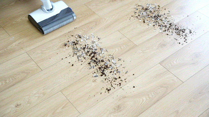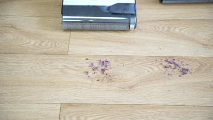 ▼添可芙万3.0可能是吸力比较小的原因,面对大量干垃圾时,会有少量垃圾从刷头后方不断漏出,需要调整机身角度反复多吸几次,最终也能把地板上的垃圾都清理干净。