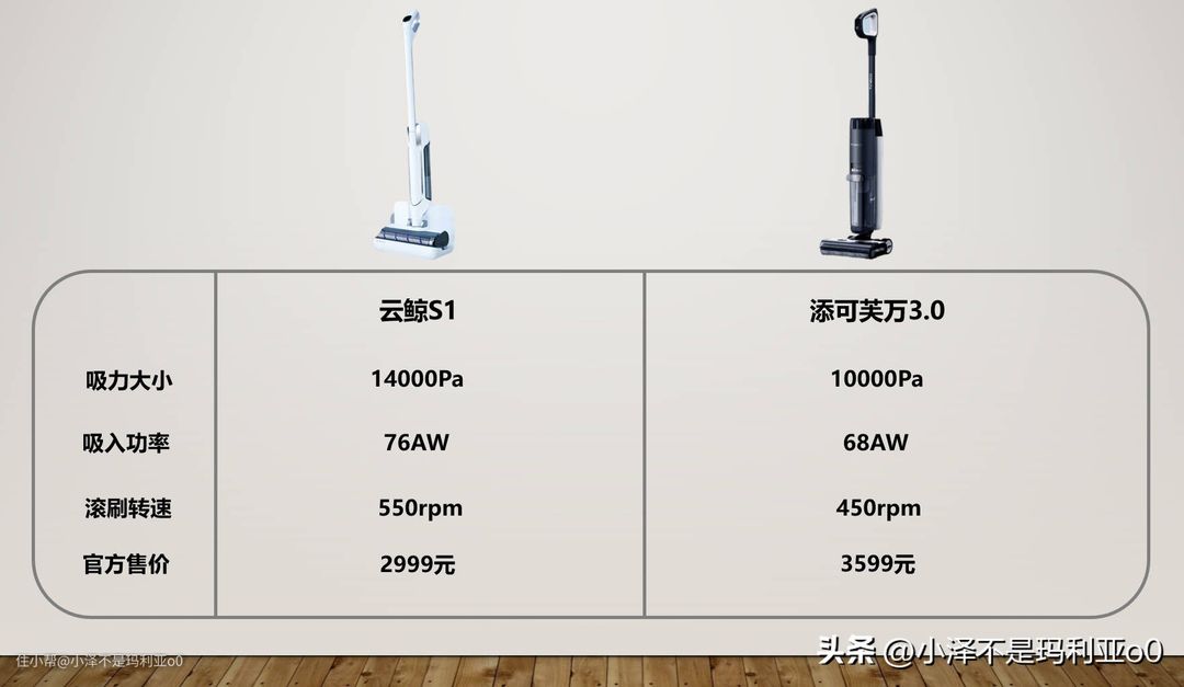 ▼关于两台洗地机的吸力参数,经过对比可以看到云鲸S1的吸力和吸入功率等参数都是要大于添可这款的。这里有个小提示,大家在选购洗地机时可以重点关注吸入功率这个值,因为在相同脏污情况下,吸入功率越大,抽吸能力才强,更大风量是提升清洁力的关键。因此相比动辄上万Pa的吸力,吸入功率AW,其实更能反映洗地机的清洁能力。
