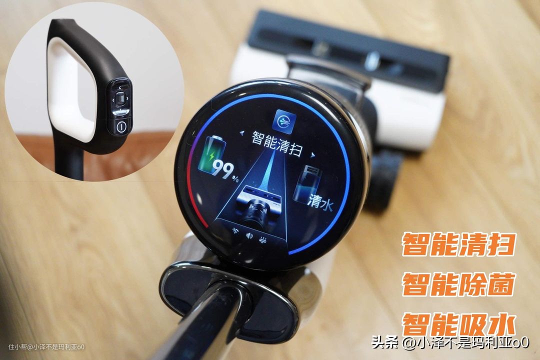▼在操控方式方面,添可的顶部有一块圆形LED屏,通过手柄上的四向按键就能在智能清扫,智能吸水和除菌模式之间来回切换,屏幕上的圆环可以直观现实地板干净程度,熟悉了之后还是很容易上手。