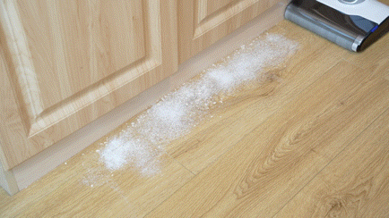 ▼在这一环节我觉得两台洗地机的沿边清洁效果都很不错,一遍过后都能将墙角的面粉清理干净。