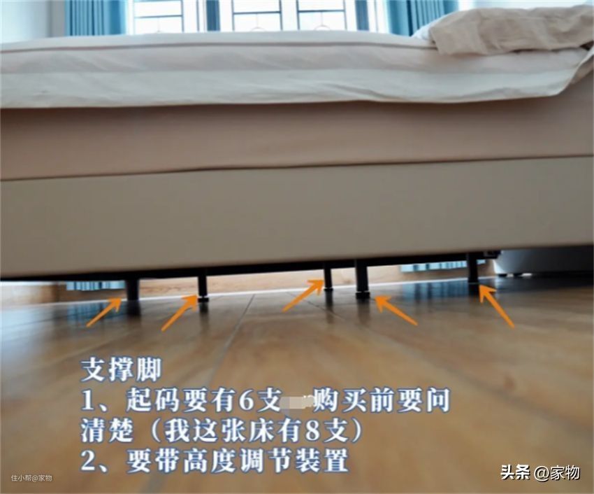 床底的支撑脚既要承重又要调节,少一个直接影响床的稳定性。一般来说,1.8米大床支撑脚不能少于6-8支,缺少支撑脚的床坚决不能买!