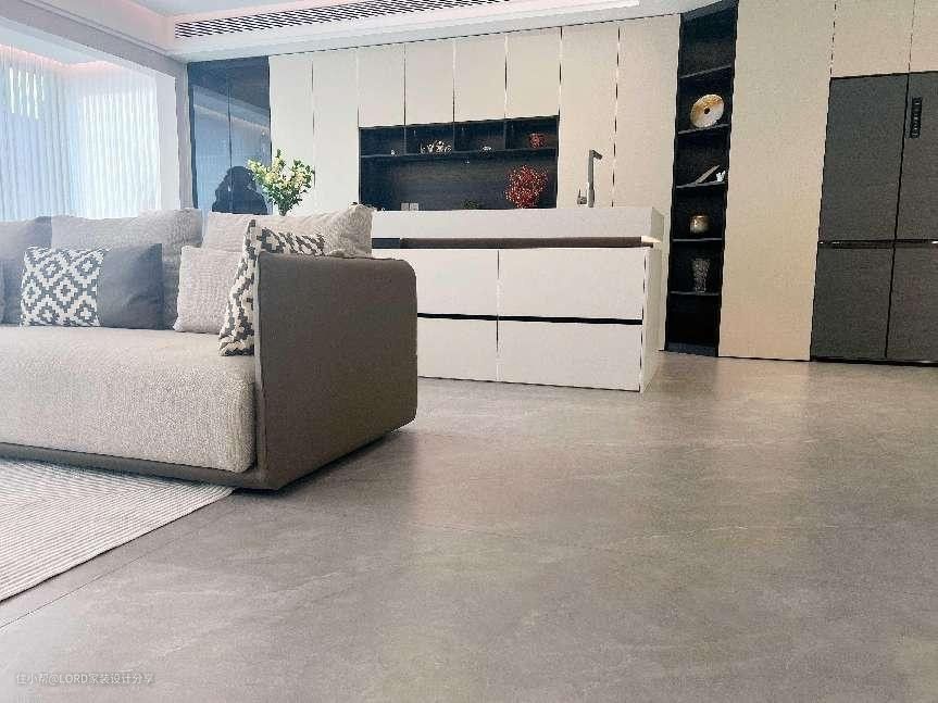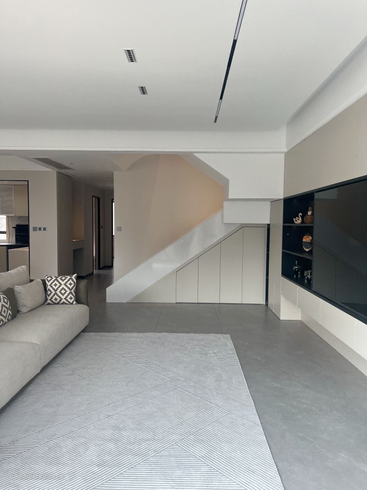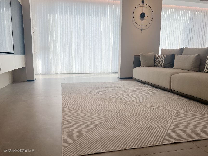 淡灰色的沙发、米白色的墙面和柜体色调、铺贴柔软的浅棕色的地毯,利用软装赋予空间一种柔和的质感!搭配简约的线条和现代的灯光设计,创造现代舒适更强的居住空间。