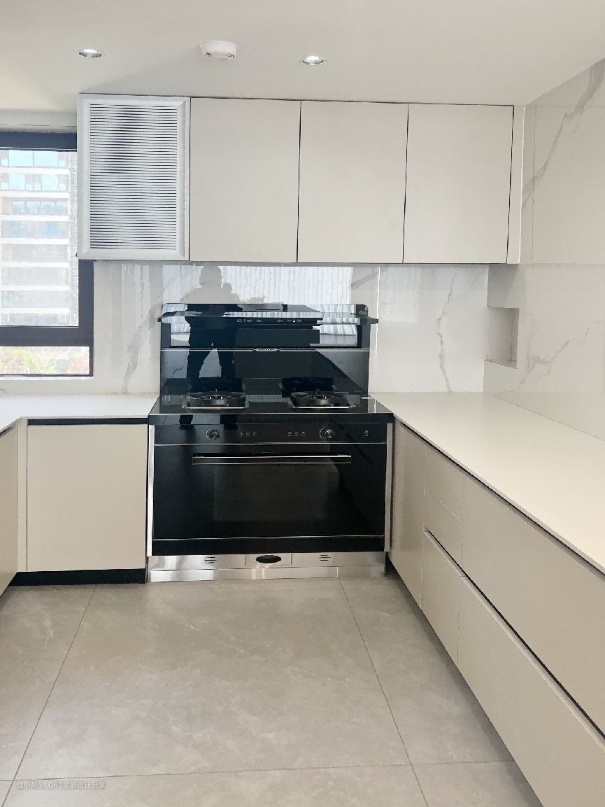 淡灰色的地砖搭配奶油白的柜体,利用简约的黑色金属配件进行搭配,将梦想中的奶油风尽可能还原,通过温暖的色彩和现代的设计,提高整个家庭的品质感。