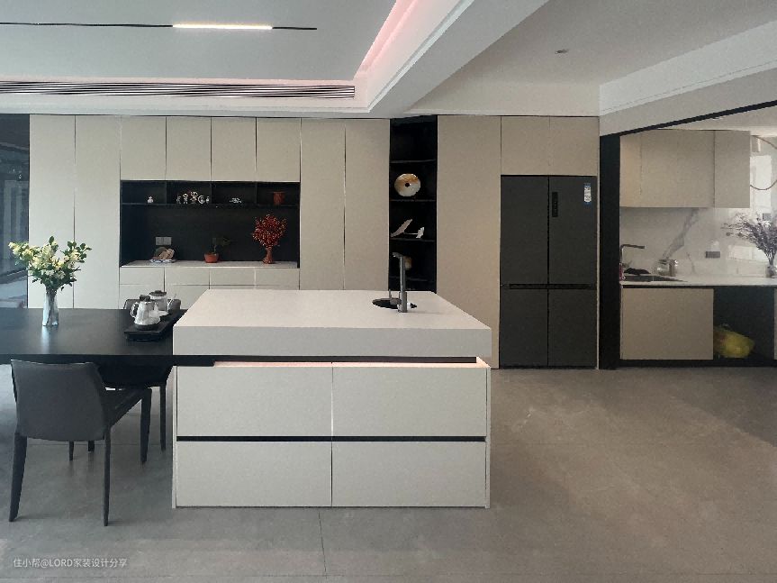 餐厅采用的是半开放式的餐厨空间设计,岩板材质的中岛台,保证了日常生活中清洁的便利性,同时将空间的使用动线作了细节规划,大大提升空间的实用性和场地的使用效率。