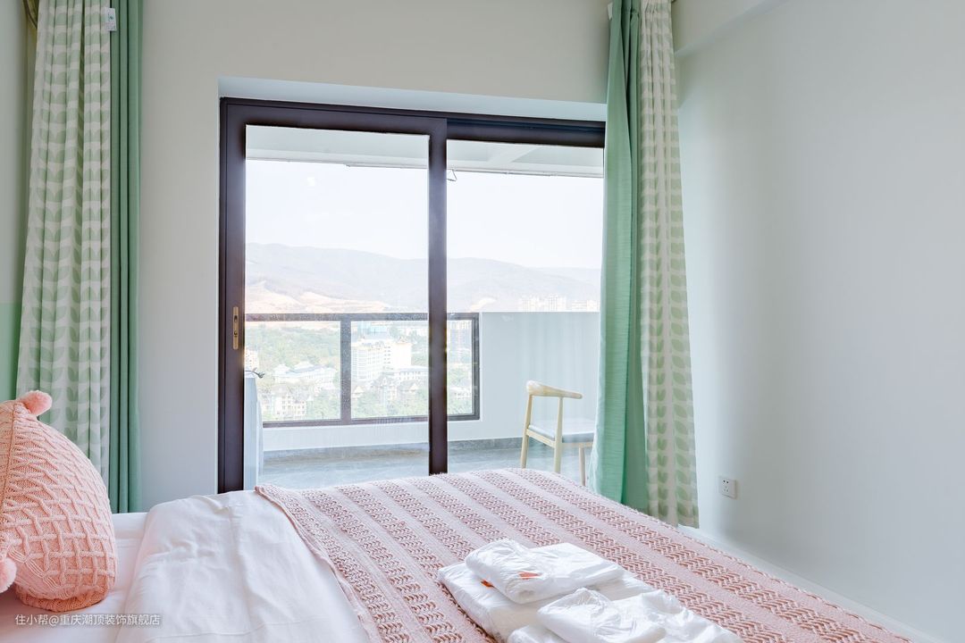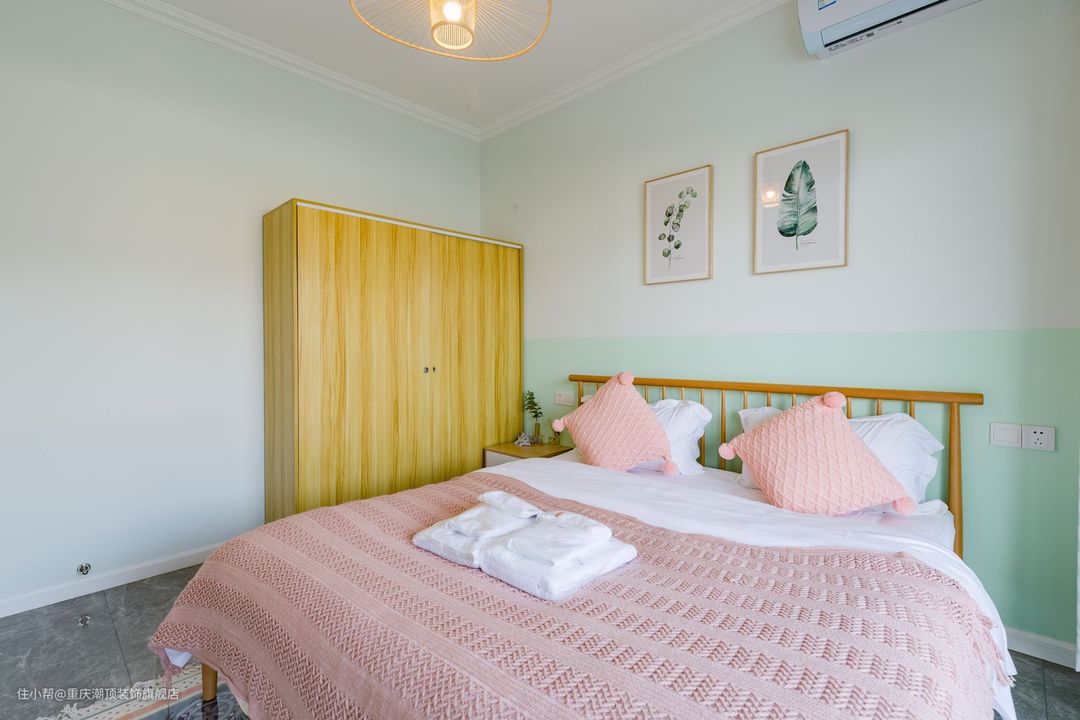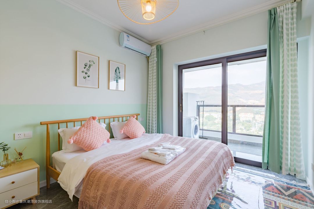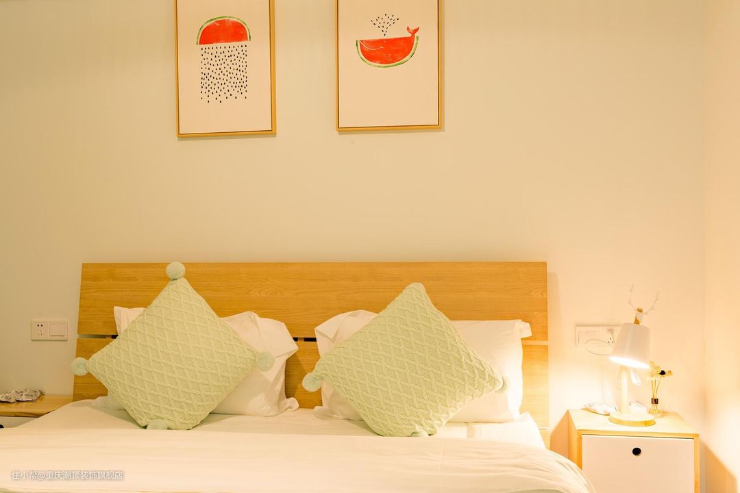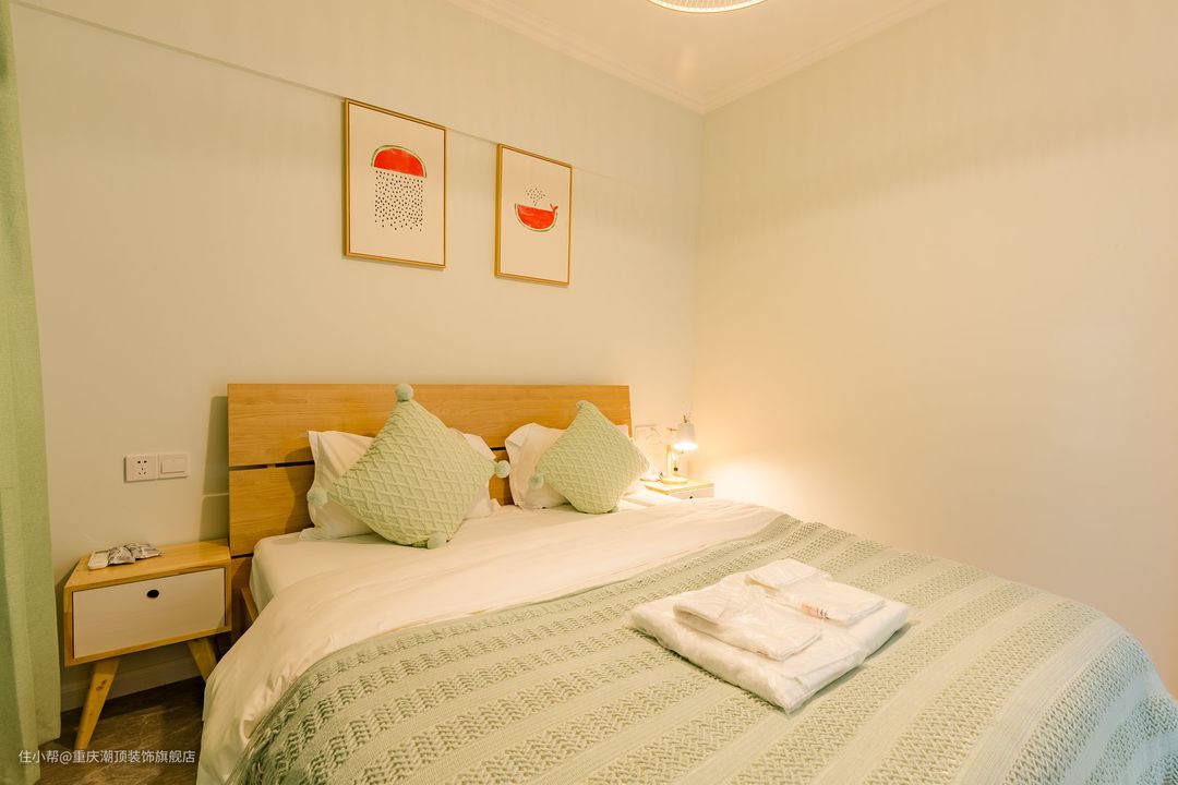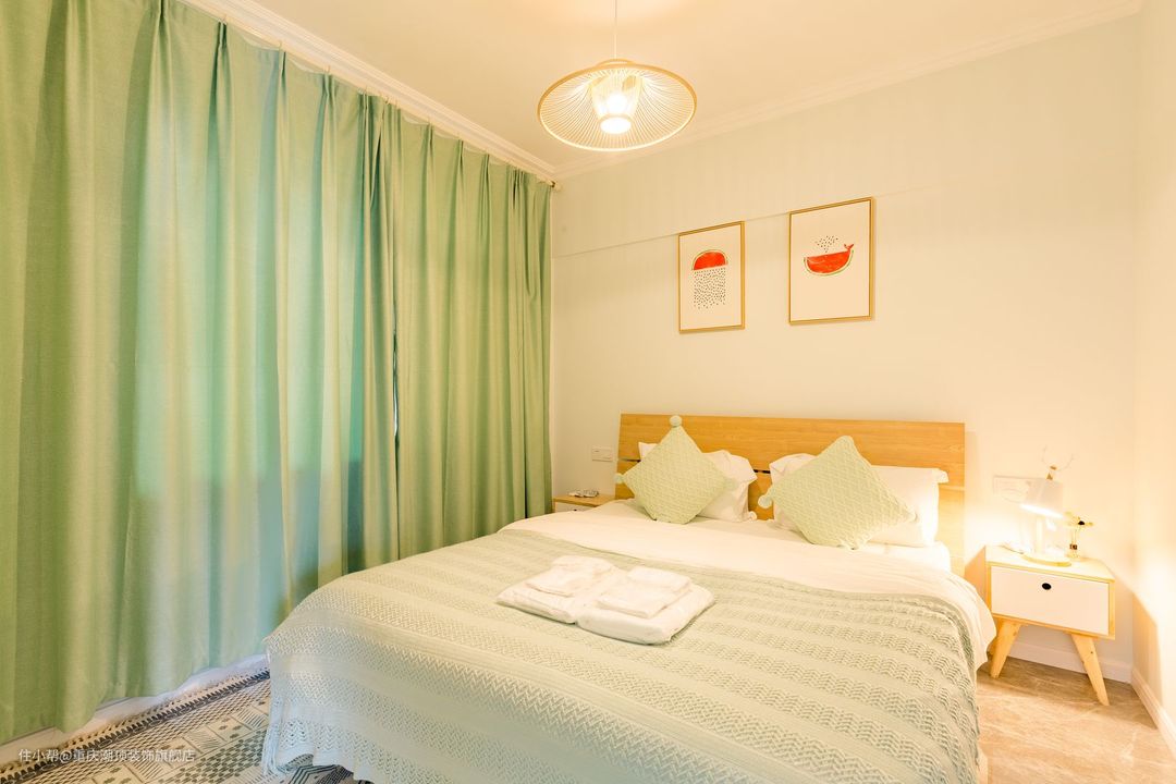 主卧做暖色系,女主人喜欢凉爽的空间,希望可以整体看起来更加小清新。在卧室里,也选择了原木系双人床,搭配自然艺术挂画,牛油果绿窗帘为夏天增添一丝凉意。