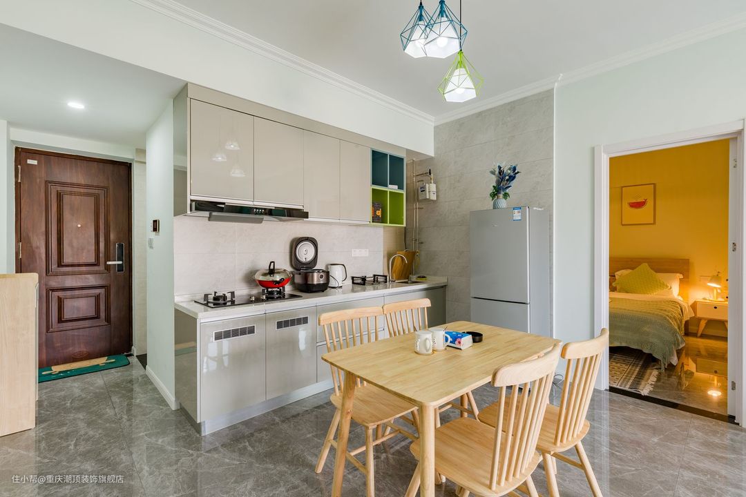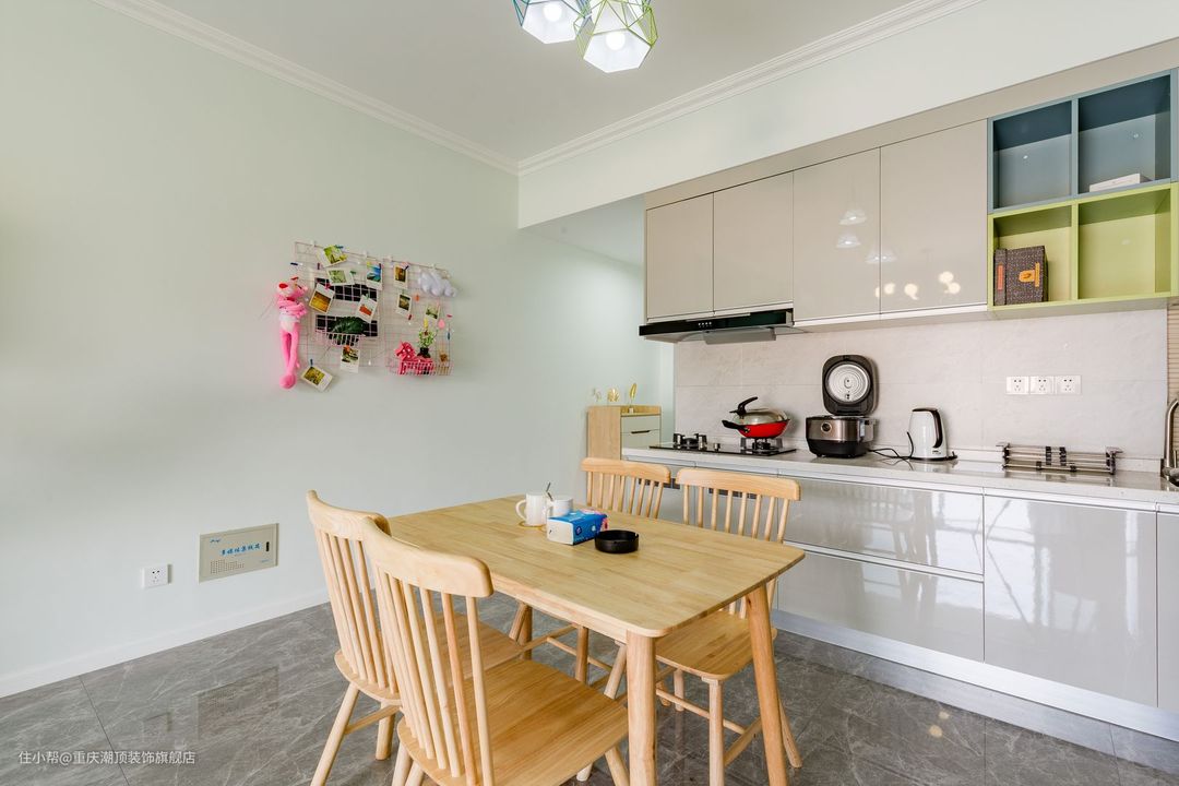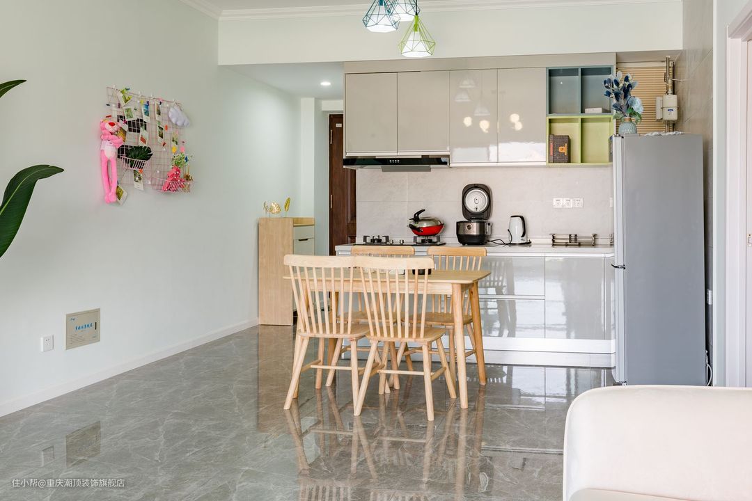 餐厅采用的是浅色原木系四人餐桌,与整体风格搭配,餐边墙体大量留白,搭配网红风挂式,让用餐变成一间极具仪式感的事情
