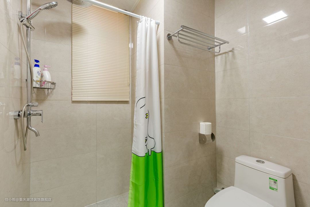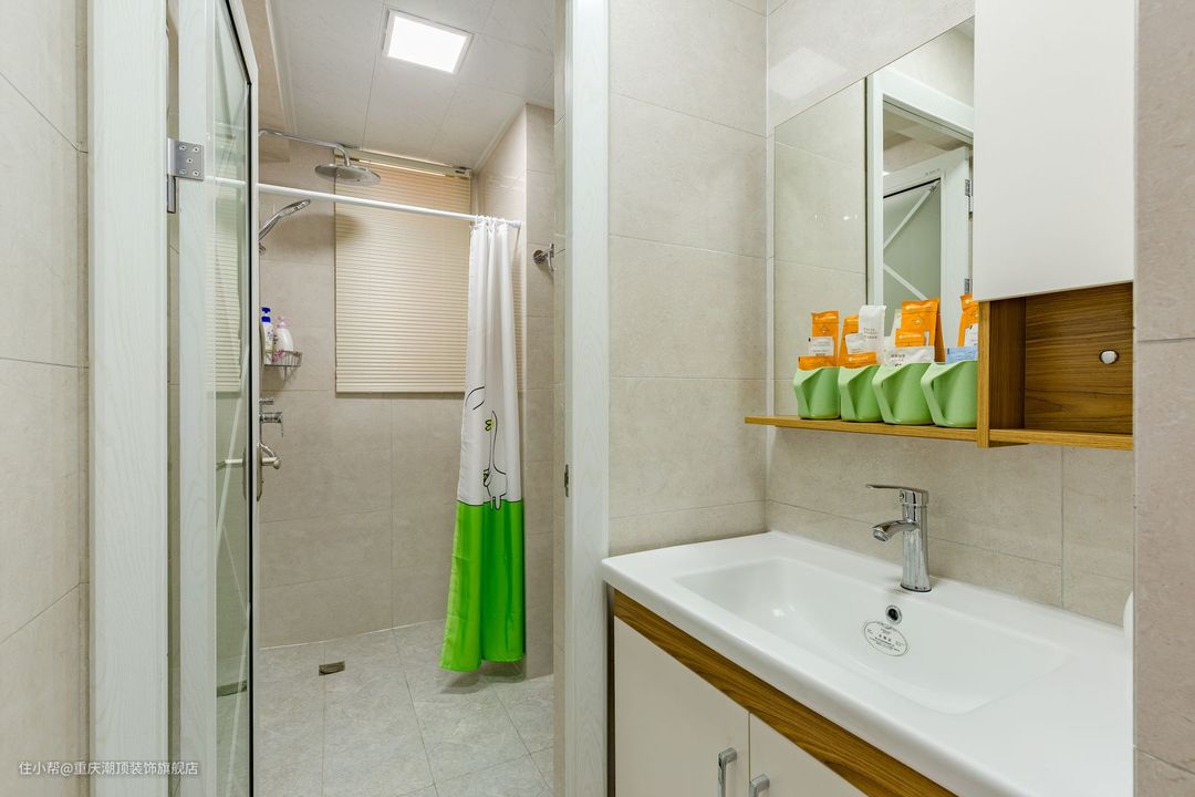 卫生间主打干湿分离,钻石淋浴房+浴帘做双重隔断,既能够保证隐私性,也能防止水花四溅,洗漱+淋浴两不耽误,可谓是两全其美之策