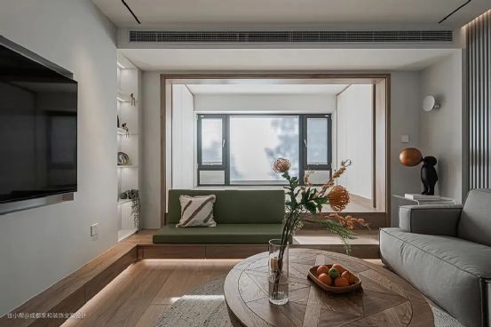 阳台做地台还可以延伸到客厅内,形成一种流动的整体感,更有趣味性。如果顶面梁比较多,可以将顶面装饰做成与地台相对应的造型,最终形成一体式的“方框”,别具一格。
