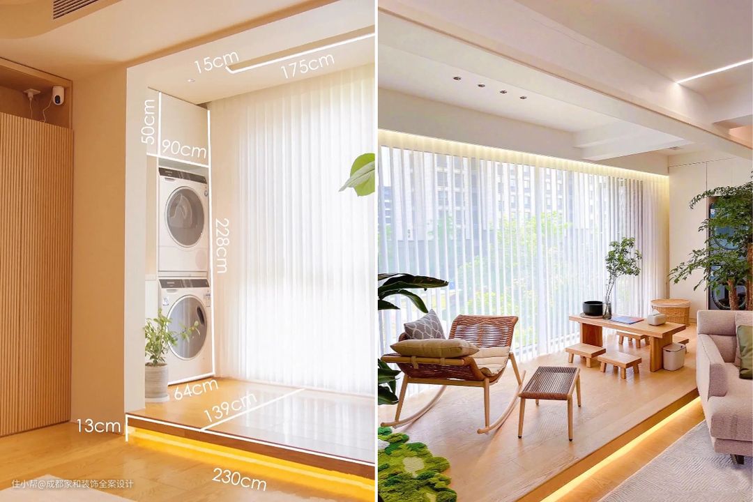 8.如果家里阳台要晾晒衣物,就不建议做地台。如果要使用烘干机可以结合地台打造一个洗衣区,根据自己的情况选择即可。