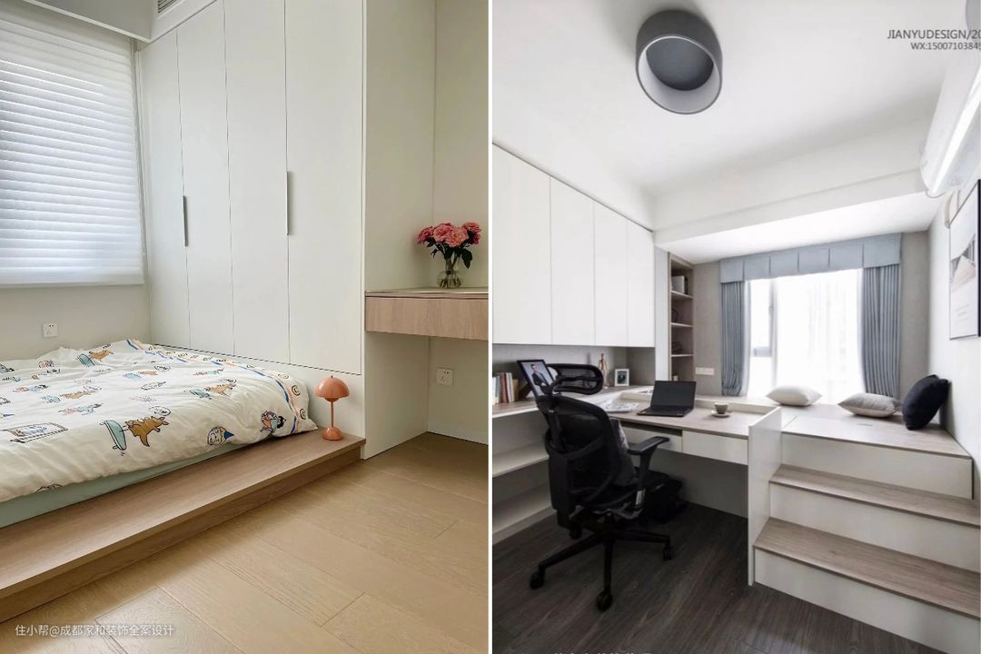 卧室做地台也就是地台床,降低了床体高度增强安全感,对于多孩家庭来说,有一个超大的床或者活动空间非常实用,高度也比传统床架更安全。