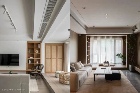 2.地台材质木质居多,触感更柔和温润,更适合席地而坐;瓷砖也行,比木地板好打理,但是质感比较冷;微水泥也可以,不过在风格上比较有局限,更适合极简或侘寂风。