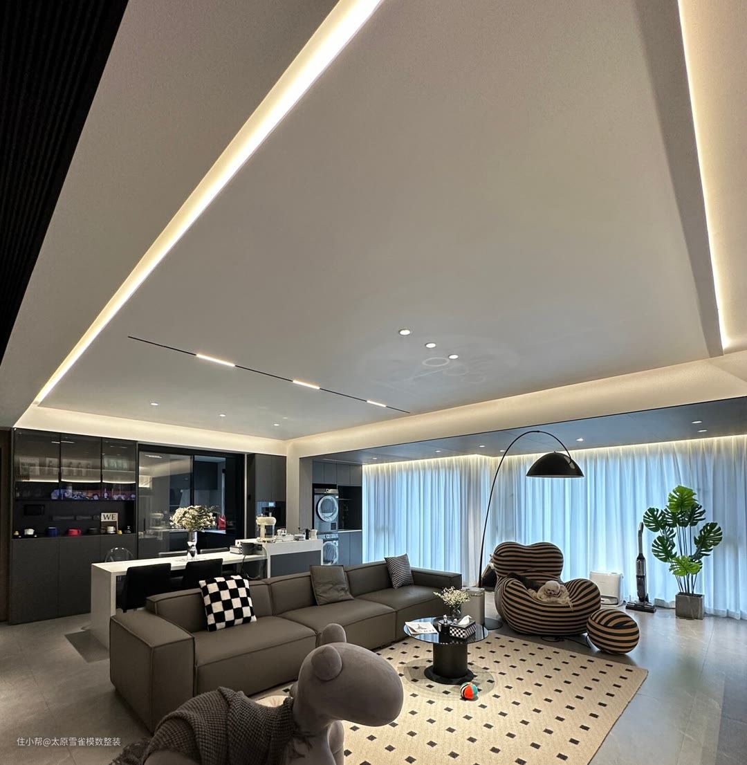 在客餐一体的空间内,也流行在餐厅做无主灯吊顶,在客厅做回字型吊顶,实现空间的错层感,让客厅在视觉上更显大气与开阔。
