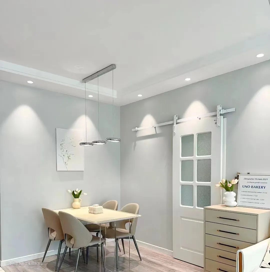 这样的局部吊顶,不需要牺牲掉整体的层高,还能让整个空间有了层次感。此外,如果包了新风系统或空调,可以做长回风口,更显空间感。