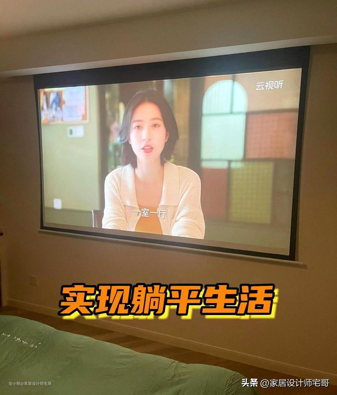 床尾一侧的墙面上安装了投影幕布,搭配上顶上的投影灯,躺在床上看大片的感觉真的超级舒服,这就是现代人的躺平生活吗?