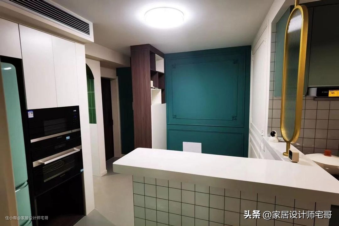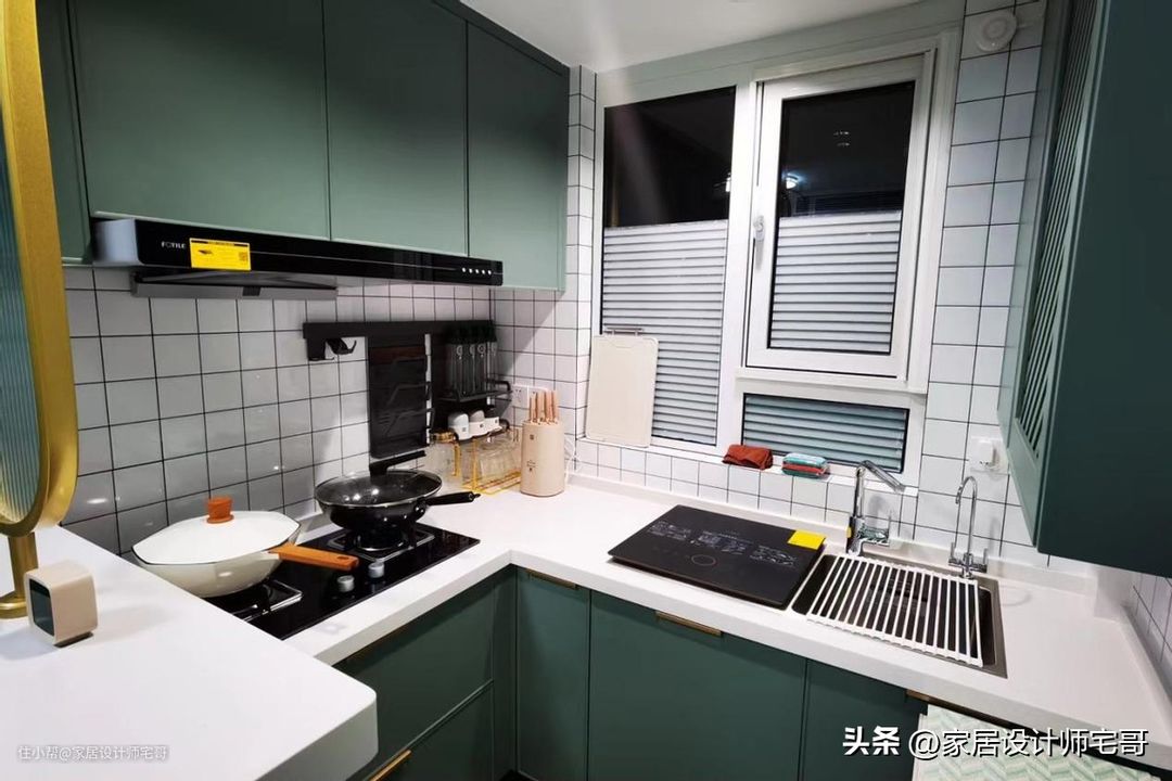 改造后的厨房是开放式的设计,整个厨房设计得是非常时尚的,墨绿色和白色、黑色这种大气的配色,显得非常高级,也很有质感。