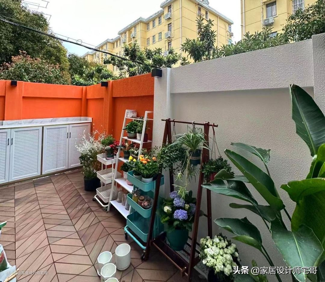这对小夫妻将整个院子进行了改造,橘色和白色墙壁搭配着满园的绿植,是整个小区最靓丽的一抹风景。