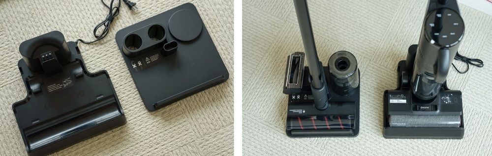 另外一个底座是洗地机的充电、自清洁和烘干底座,需要接电使用后,可以看到即便是两套机器,收纳起来占用空间也是不大的。