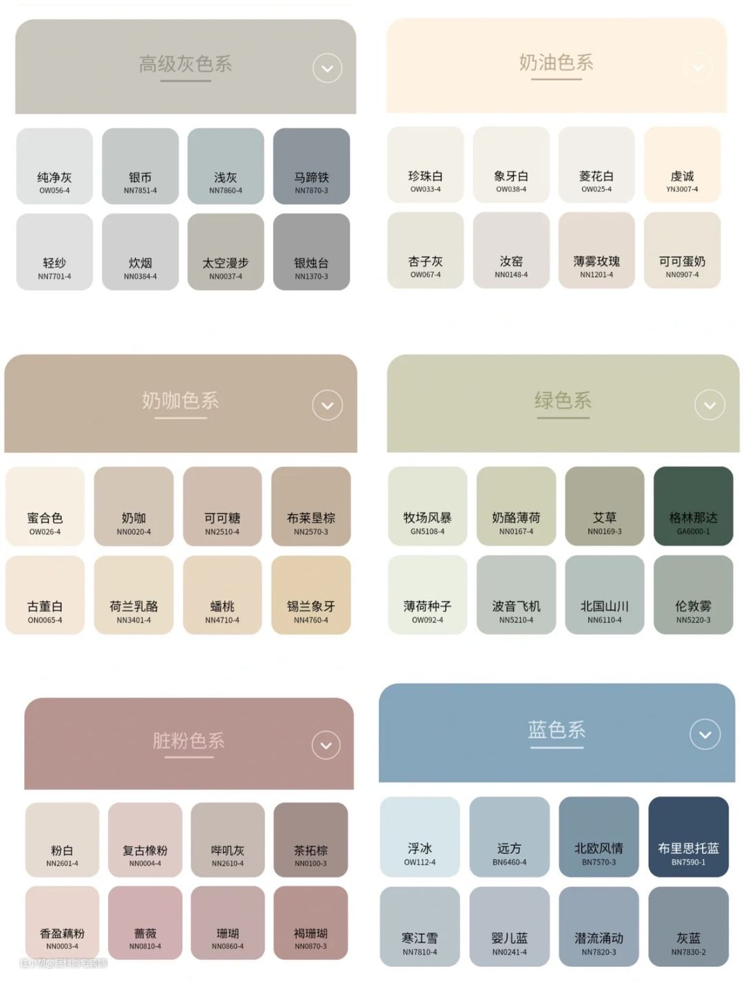 常用低饱和度、高明度的色彩,例如:奶白色、珍珠色、浅咖色等等。