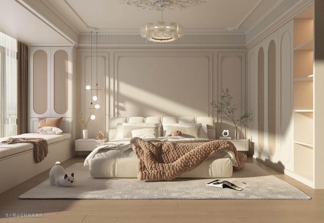 从硬装部分来说,造型主要体现在顶面和墙面。一般采用平面吊顶,局部边吊或者可以选择弧度吊顶,也可以选择一下石膏线的造型设计。但最主要的是一定要简洁干净,这样才可以保证空间的整体性。在选择这类型吊顶的同时,还可以结合暗藏灯带的设计,更加能营造温暖柔和的奶油的氛围感同时更加富有层次感。