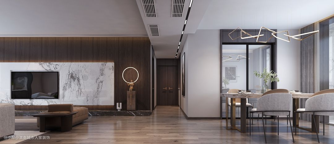 在用色上内敛又含蓄,成熟稳重的深胡桃木色以及不同层次灰白色的采用,减少空间的沉闷感,体现现代新中式的清新简约以及素雅。