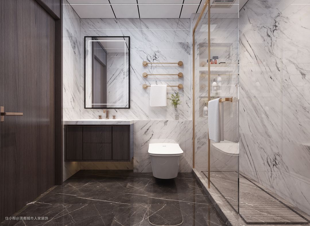 胡桃木色的悬浮洗漱柜与白色大理石台面色调和谐,日常洗漱用品收纳其中毫无压力。一侧定制隐藏水箱式的悬浮马桶,减少卫生死角,日常打扫起来也是省心省力。